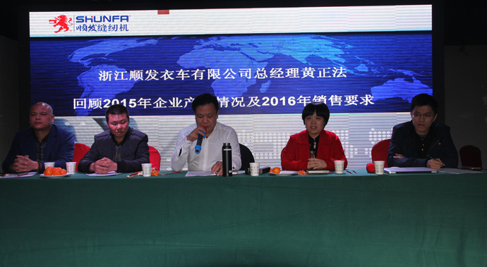 在年会上,顺发公司董事长黄正法总结了2015年企业产销情况及重点阐述了2016年销售要求。黄总说,是经销商朋友的支持与拼搏成就了今天顺发公司的希望和发展,你们对公司的发展功不可没。由于2016年,经济复苏的不确定性上升,将会造成市场的恶性竞争越来越激烈。因此16年公司也会根据实际的市场情况在产品结构上,着重开发自动化产品。目前,公司已扩大研发团队,陆续开展研发新型、智能、节能化产品。重点开发市场特需产品,为市场量身定做特色产品。抢抓机遇,占领先机,将公司的各项事业在2016年纵向深推,努力实现公司的全面、协调、可持续发展。也将通过加快模式转型,坚持差异化发展;抓住服装转型升级机遇,提升创新能力;同时积极开拓国际市场,拓展横向发展空间,让公司突破严峻的市场局面。在会上黄总也为经销做出更清晰的指引,争取赢得市场、赢得消费者!